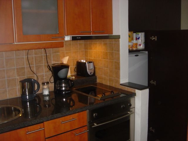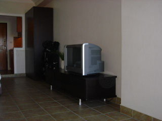 Fully furnished kitchen, refrigerator, oven, television, air conditioner.